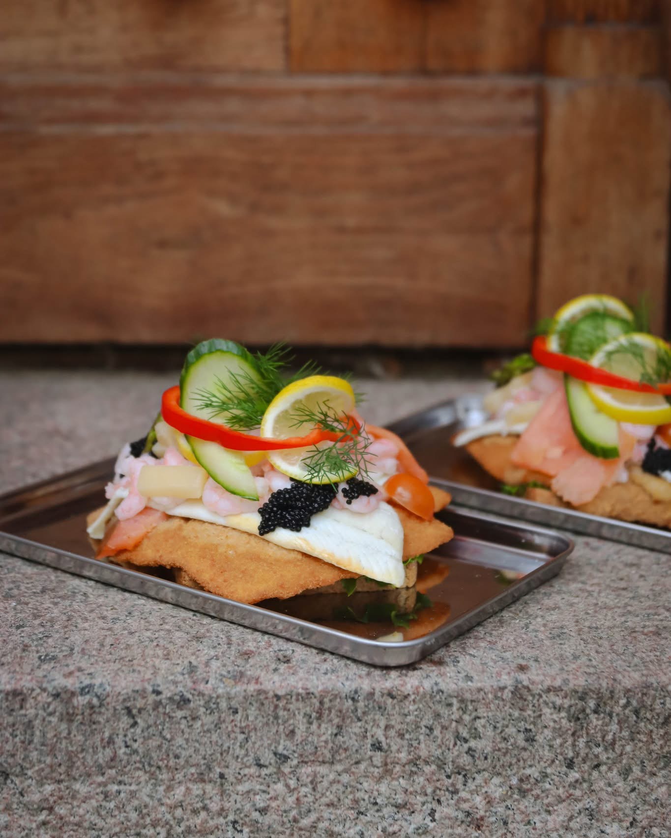 smørstegte fisk, der sprød og saftig. Friske rejer, der smager af hav og sommer. En cremet, delikat skaldyrsdressing, der binder det hele sammen med et strejf af friskhed fra sprøde grøntsager og knasende agurk.